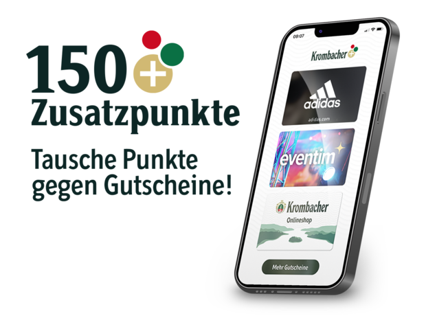 *Gültig für Neukunden, die im Aktionszeitraum 24.09.-24.10.2025 die Krombacher App herunterladen. Die 150 Punkte werden nach der ersten Anmeldung in der Krombacher App automatisch gutgeschrieben.